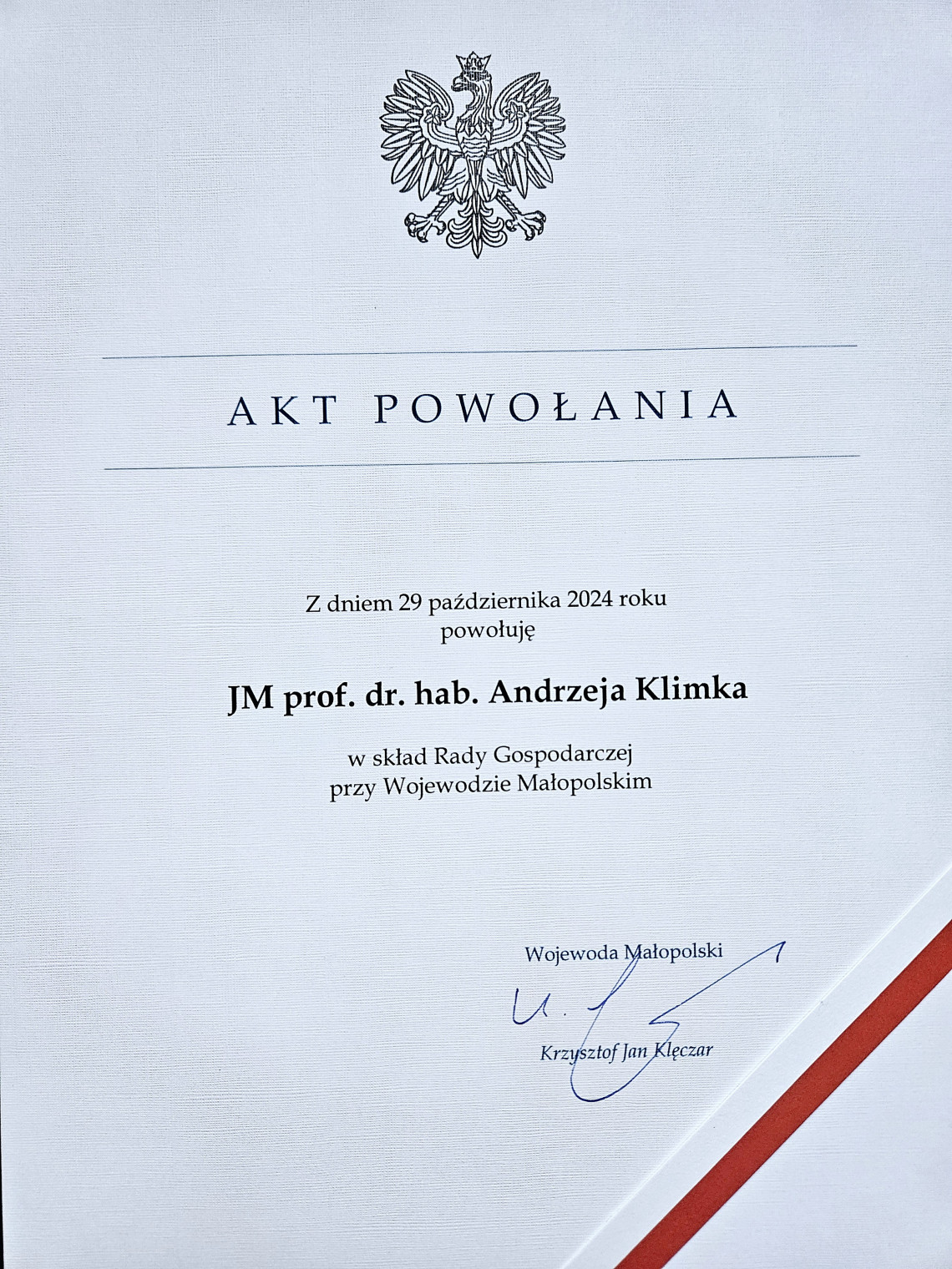29 października 2024 r. Wojewoda Małopolski Krzysztof Klęczar powołał Rektora naszej Uczelni prof. Andrzeja Klimka do Rady Gospodarczej przy Wojewodzie Małopolskim. W skład Rady weszło 30 osób będących przedstawicielami administracji publicznej, świata nauki, sektora prywatnego i przedsiębiorstw działających na terenie województwa. To zespół doradczy Wojewody w zakresie ważnych dla Małopolski spraw związanych z szeroko rozumianą gospodarką.