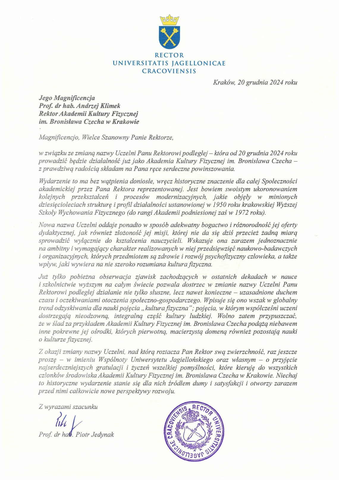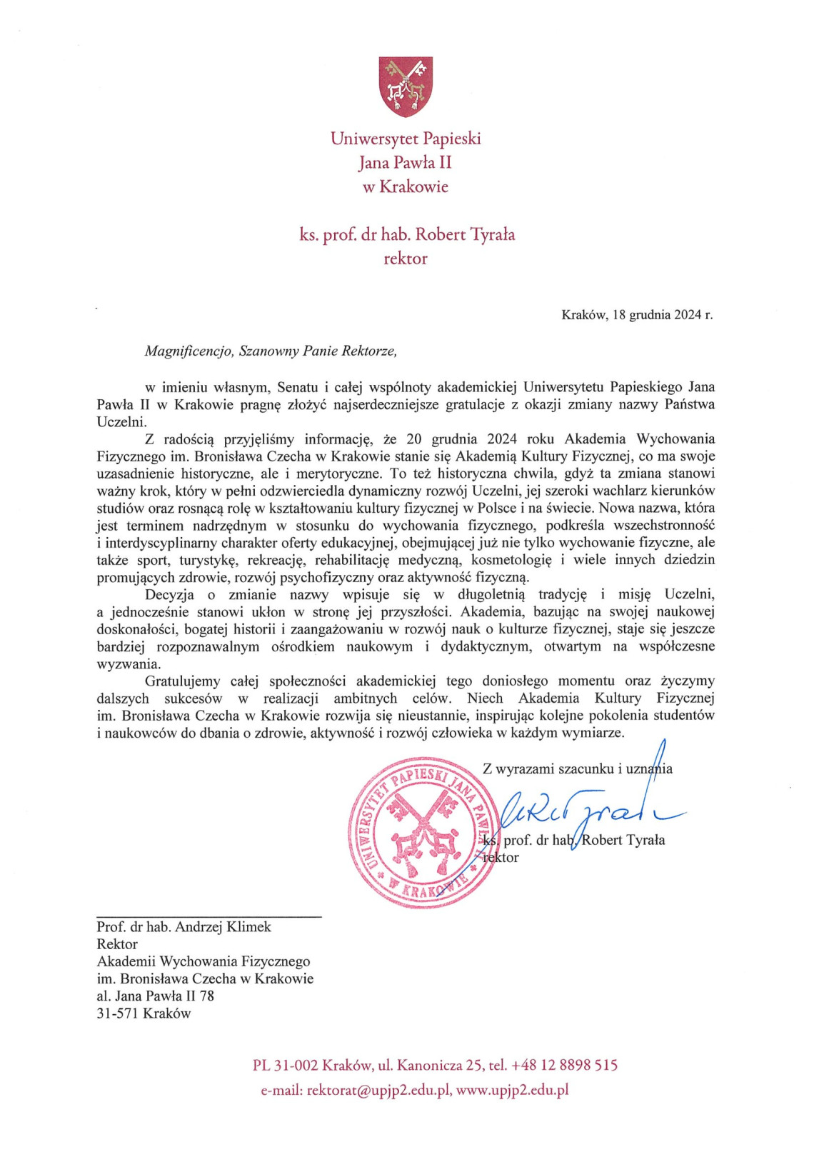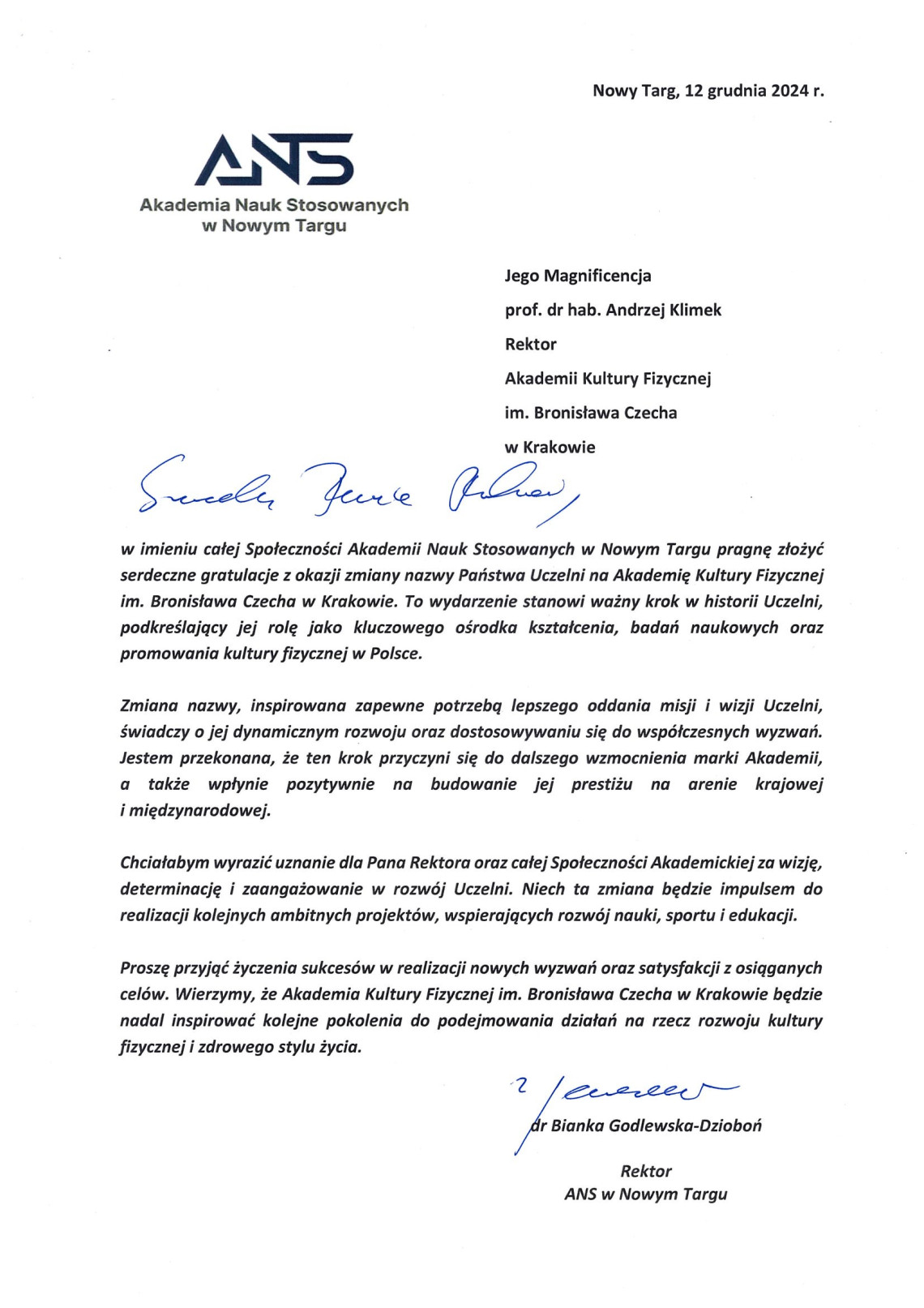 Z okazji zmiany nazwy naszej Akademii, JM Rektor prof. dr hab. Andrzej Klimek otrzymał listy gratulacyjne od: JM Rektora Uniwersytetu Jagiellońskiego - prof. dr hab. Piotra Jedynaka, JM Rektora Uniwersytetu Papieskiego Jana Pawła II w Krakowie – ks. prof. dr hab. Roberta Tyrały oraz JM Rektor Akademii Nauk Stosowanych w Nowym Targu – dr Bianki Godlewskiej-Dzioboń.