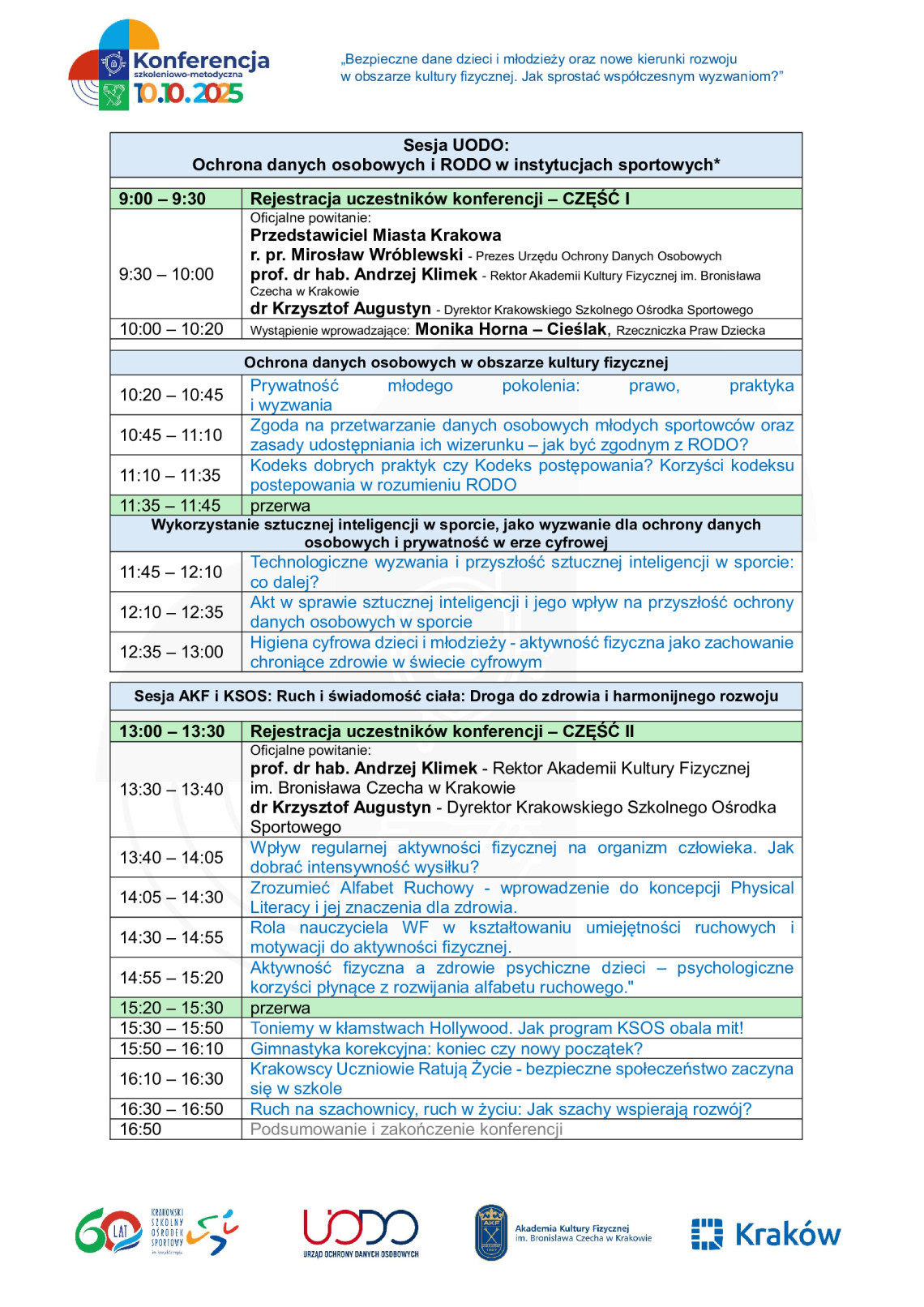 Prezydent Miasta Krakowa, Prezes Urzędu Ochrony Danych Osobowych, Rektor Akademii Kultury Fizycznej im. B. Czecha w Krakowie oraz Dyrektor Krakowskiego Szkolnego Ośrodka Sportowego im. Szarych Szeregów w Krakowie mają zaszczyt zaprosić na konferencję szkoleniowo-metodyczną pn. "Bezpieczne dane dzieci i młodzieży oraz nowe kierunki rozwoju w obszarze kultury fizycznej. Jak sprostać współczesnym wyzwaniom?", która stanowi część obchodów 60-lecia Krakowskiego Szkolnego Ośrodka Sportowego im. Szarych Szeregów.