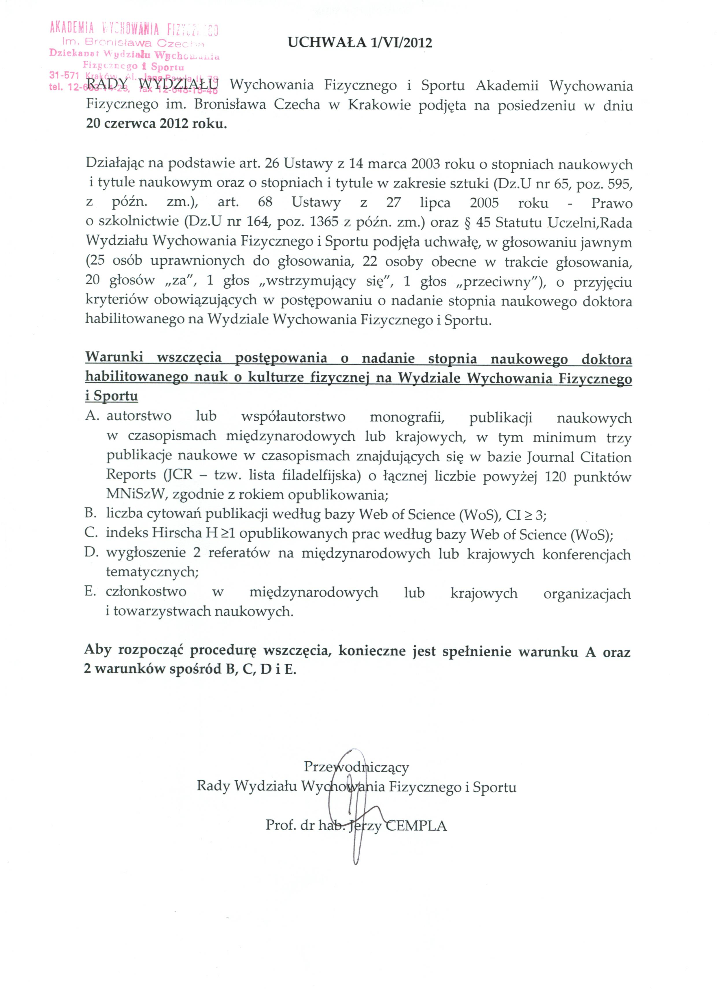 Warunki wszczęcia postępowania o nadanie tytułu naukowego profesora nauk o kulturze fizycznej oraz nadanie stopnia naukowego doktora habilitowanego nauk o kulturze fizycznej na Wydziale Wychowania Fizycznego i Sportu