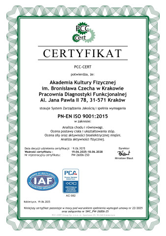 Pracownia Diagnostyki Funkcjonalnej zajmuje się oceną narządu ruchu, pozwalając na wykrycie występujących dysfunkcji, ograniczeń czy asymetrii. Oferowane badania z wykorzystaniem obiektywnych narzędzi umożliwiają kompleksową analizę funkcjonowania narządu ruchu pacjenta lub zawodnika. Wyniki badań mogą być wykorzystane podczas planowania terapii lub treningu sportowego oraz pozwalają na ocenę ich skuteczności.Dostępne sprzęty umożliwiają także realizację programów usprawniających.