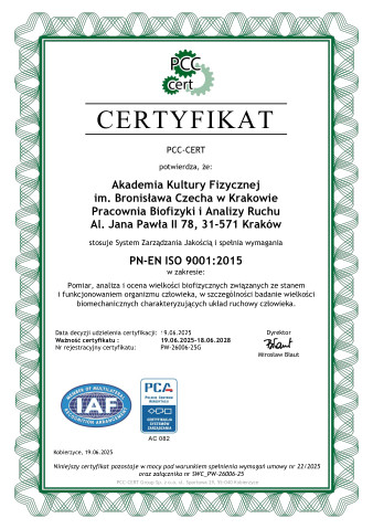 Zakres badań prowadzonych w Pracowni Biofizyki i Analizy Ruchu obejmuje pomiary, analizę i ocenę wielkości biofizycznych związanych ze stanem i funkcjonowaniem organizmu człowieka, a w szczególności badanie wielkości biomechanicznych charakteryzujących układ ruchowy.